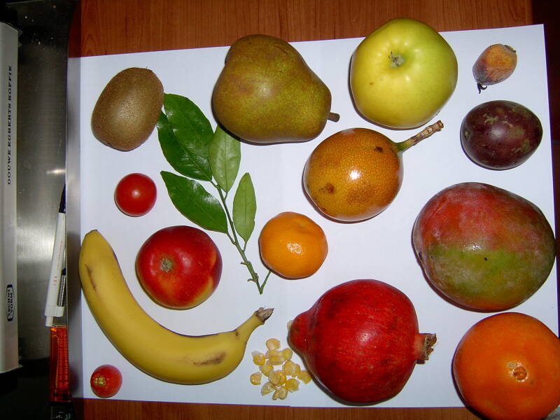 Fruit/ Groente in allerlei soorten (behalve Advocado) zoals: Vijg, Appel, Bessen, Sinaasappel, Druif, Mandarijn, Kiwi, Mango, Sharon, Granaatappel, Grapefruit, Kaki, Papaja, Rozenbottel, Wortel etc.